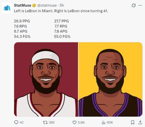 数据媒体StatMuse晒出41岁詹姆斯与热火詹时期的数据对比,41岁的詹姆斯得分、篮板、助攻、命中率还更高,这说明这个老头依旧还保持着巅峰的状态,本赛季场均33分钟拿到22.4分5.7篮板6.9助攻1.1抢断0.6盖帽,命中率51%,他达成连续23个赛季的场均20+5+5看起来是板上钉钉。